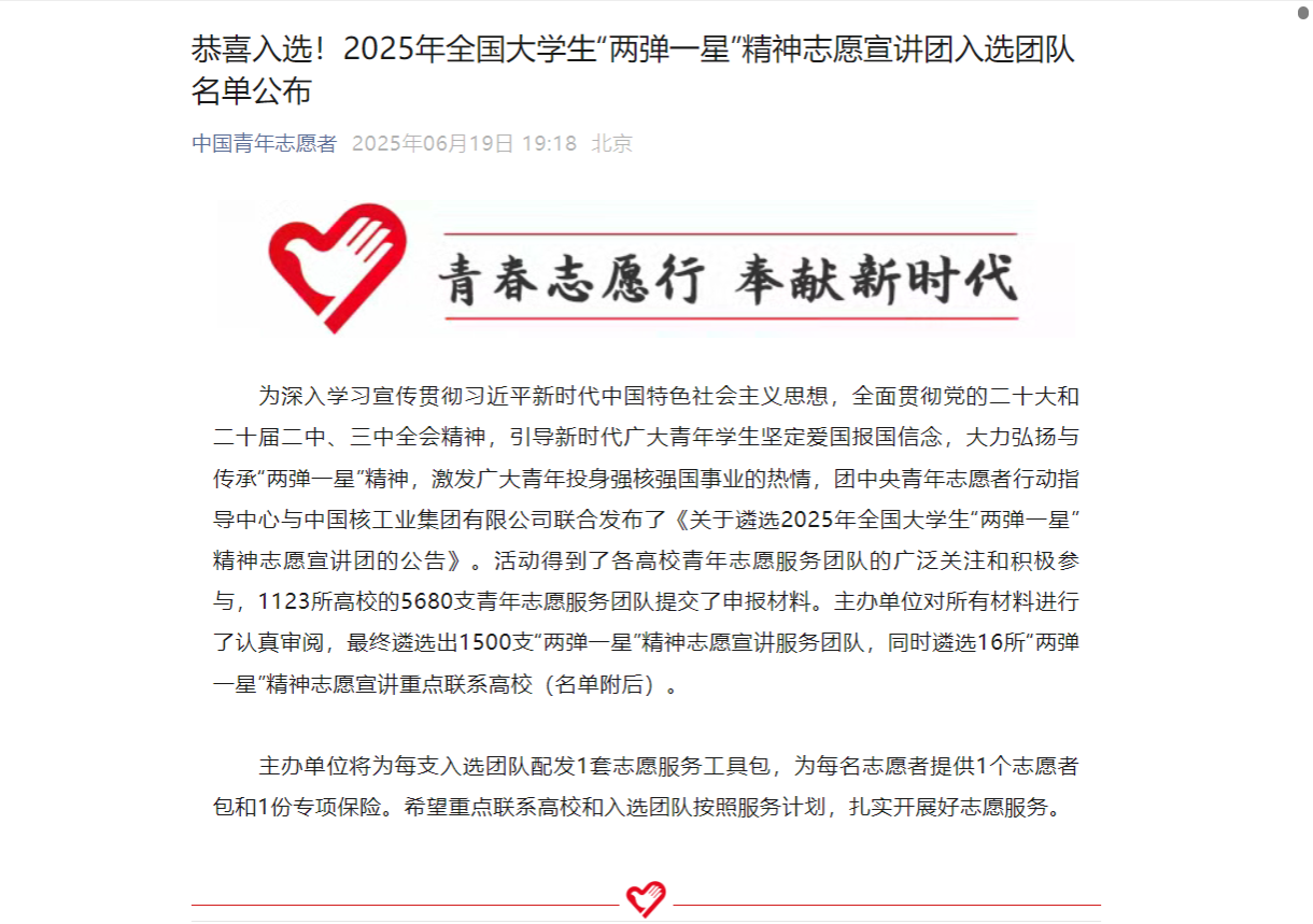 为深入学习宣传贯彻习近平新时代中国特色社会主义思想,全面贯彻党的二十大和二十届二中、三中全会精神,引导新时代广大青年员工坚定爱国报国信念,大力弘扬与传承“两弹一星”精神,激发广大青年投身强核强国事业的热情,团中央青年志愿者行动指导中心与中国核工业集团有限公司联合发布了《关于遴选2025年全国老员工“两弹一星”精神志愿宣讲团的公告》。活动得到了各高校青年志愿服务团队的广泛关注和积极参与,1123所高校的5680支青年志愿服务团队提交了申报材料。主办单位对所有材料进行了认真审阅,最终遴选出1500支“两弹一星”精神志愿宣讲服务团队,同时遴选16所“两弹一星”精神志愿宣讲重点联系高校。公司304永利集团“煤”好星辰志愿宣讲团成功入选。