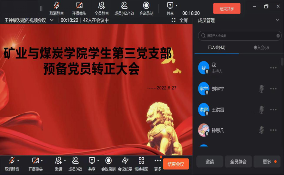 2022年5月27日下午16:20,公司员工第三党支部于钉钉平台线上开展预备党员转正大会。本次会议由支部书记闫妍同志主持,支部全体党员参加。