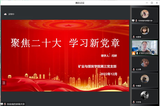 2022年12月13日下午16:30,公司员工第三党支部利用腾讯会议平台开展党员党课学习,本次学习的主题是:聚焦二十大,学习新党章,领学人:闫妍同志。