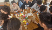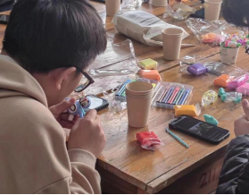活动现场,同学们选择不同的材料与自己的小伙伴三三两两各自围成一个小圈,全神贯注的制作着他们的作品。